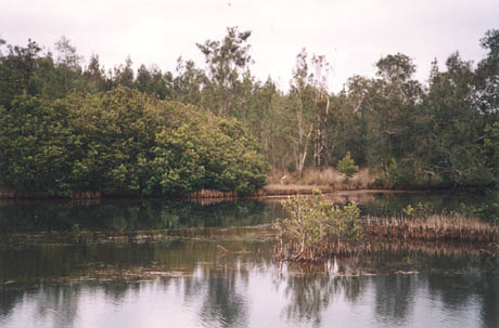 Basin, NSW Australia. Click here to see Pat's Bay Wetland location Map. GENERAL DESCRIPTION Extensive mudflats along the margins of the embayment and the lagoon support zones of salinity-tolerant wetland vegetation. Further seawards, fossiliferous Wandrawandian siltstone forms a rocky margin to the mudflats. VEGETATION ZONES Common Reed (Phragmites australis), forms a dense reedland at the western extremity of the lagoon. The presence of this reed indicates that the water at this end of the wetland is more or less fresh, that is, tidal flushing does reach here. Mangroves edge the mudflats throughout the wetland, in a belt of varying thickness. Melaleuca ericifolia forms a zone behind the Mangroves in places. Juncus rushland grows along the water margin in parts of the lagoon. Samphire (Sarcocornia quinquefaria) and Seablite (Suaeda australis) forbland grow on mudflats on the landward side of the mangroves. Swamp Oak forest (Casuarina glauca) bounds the wet-land on the landward side of the salt-tolerant species. Swamp Weed (Selliera radicans) closed forbland, Saltwater Couch grassland, or Common Reed cover patches of swampy ground near the Swamp Oak forest. Open Eucalypt Forest occupies Crown Land behind the Casuarina glauca zone, on both Tallyann Point and Pelican Point. This forest buffers the wetland from the effects of development. It has largely already been cleared from the area currently under assessment. Click here to continue.