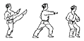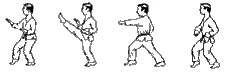 Left front kick landing in a left front stance, and execute a right reverse punch. Keeping your right foot planted, move left foot back into a tiger stance and execute a left inside palm block