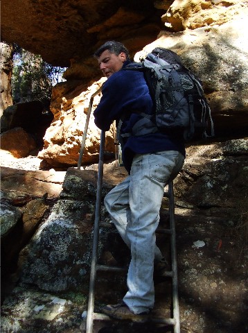 Gary Williams descending the ladder that negotiates a route from the top to bottom of Forty Foot Falls