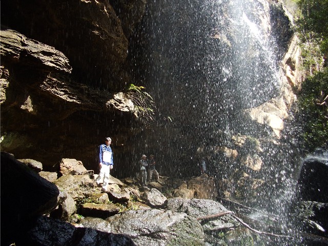 We now followed the track eastwards until we could hear the sound of rushing water and I immediately recognised this spot. Last year we had visited Forty Foot Falls from a different walk and I recognised the track and ladders. We had arrived at the cliff edge at the top of Forty Foot Falls. We now negotiated the steel ladder that helped us descend the more difficult part of the rock face then followed the steps cut in the track which descended to the bottom of the falls. Some interesting scrambling over a fallen tree and the usual rocks brought us to a ledge under the waterfall and again the cameras were out for a series of photographs.