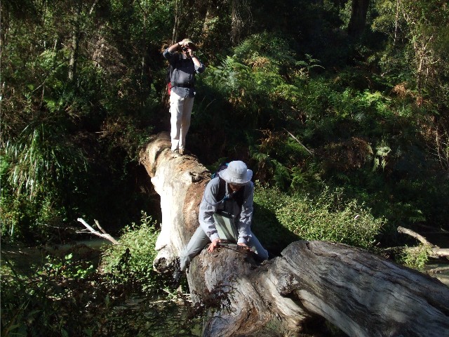 Which way to cross was the question. The river was shallow enough here to cross with the minimum of wet footwear, the rocks small but negotiable. The other option was a large tree that had fallen across the river. Here good balance would be required. I opted for the rocky crossing, but John, Gillian, Brett and Karen opted for the tree, Karen negotiating on her backside for which I could not resisted the jibe "Stop Arsing Around".
