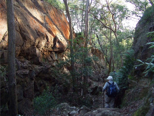 I suggested to Gillian jokingly that having to do this ascent was all her fault, but in reality her getting lost was a godsend as having to do the original route would have meant a treacherous descent down the same incline which would have played merry hell with my dodgy knees at best. Despite the extreme difficulty of climbing I knew I would prefer this to the descent. Eventually we noticed the track was passing through a rock cutting and I knew we were close to the top and shortly after, quite breathless we stepped out on top of the ridge and found a tree log to sit on and settle the heartbeat. I would have to consider this ascent to be the steepest and most difficult ascent I have had to negotiate in over 26 years of hiking/bushwalking and I've done a few ascents in my time during those years.