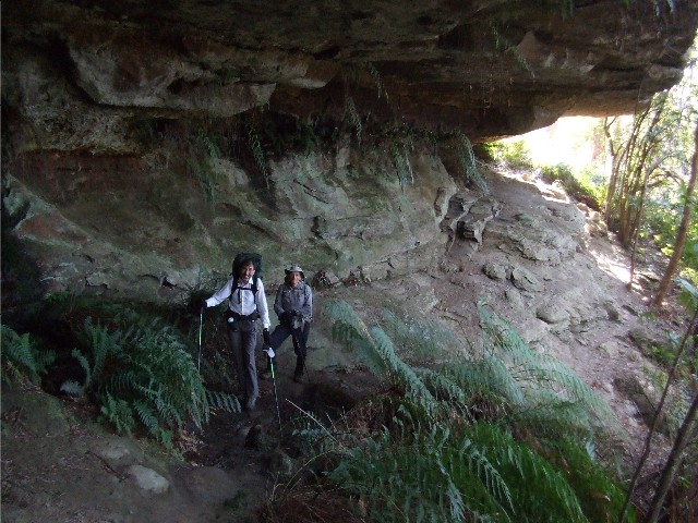 Ian and Max making their way through one of the many camping caves (Overhangs) at the base of the Mt Haughton cliffline (Aug 2013)