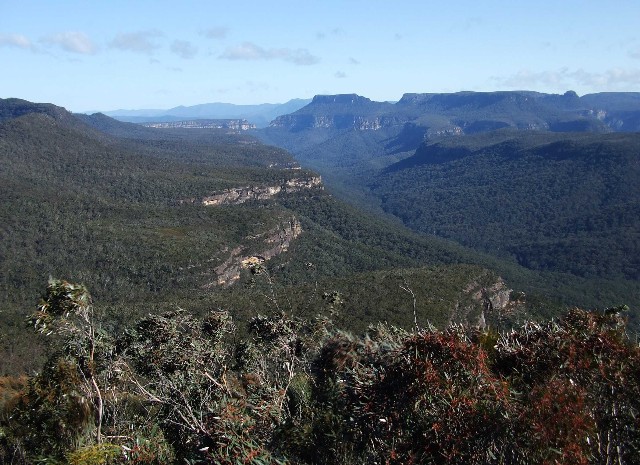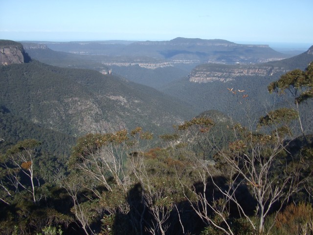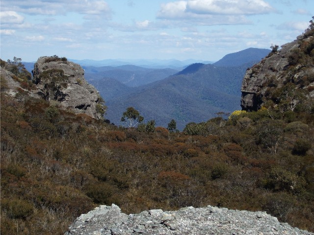 The view looking south east from the top of Quiltys Mountain near the Bora Ground - looking down the Kilpatrick Creek valley towards Holland Gorge and Pigeonhouse Mountain in the distance (2015)