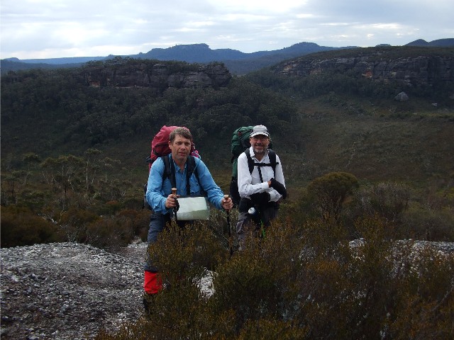 Paul and Ian stand near the top of the Conglomerate Slope, the ascent onto Corang Plateau with Profile Rock Hill behind (Aug 2013)