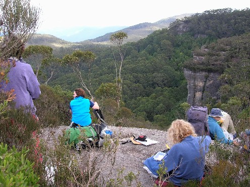 We dropped packs on an open rocky area that had views down Broula Brook. We backtracked to a small side track that descended to a large rock rib, from the top of which we all gathered for one of the best views on the Corang River. The rib drops precipitously to the river far below, but the views include three impressive waterfalls just below the junction of the Corang River with Canowie Brook. Colin again amazed us with his temerity by scrambling to the narrowest edge of the rib for better views. He was soon joined by Lani, but Michael and I (who had less than perfect heads for heights) preferred to remain at the widest section and enjoy what views we could.