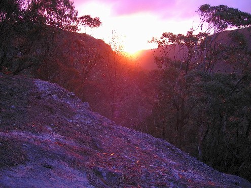 We spent the next couple of hours preparing our sleeping areas, cooking up dinner and collecting more firewood. This was interrupted by Colinís sighting of a bright red sunset in the west. We all made our way along the base of the cliffline to get a better look. Unfortunately trees blocked the best views, but some climbed up the rock face to the top of the escarpment for a better look. It wasn't the perfect red sunset and it didn't last too long and we were soon back at the main cave organising our meals and starting the campfire. It was well and truly dark by the time we had finished our meals. Although the cave was well sheltered from the wind, one soon felt the chill when venturing outside. Dinner was marred only by Colin's accident as he burned his fingers while moving the hot handle of his billy - lucky we had a couple of nurses in the form of Sue and Julie who quickly administered first aid. Both came in for much attention during the weekend as Karen aggravated her troublesome foot injury during the trip. We stood or sat around the campfire telling jokes and stories, or in the case of several of our party, held a farting contest which was considered a tie between myself, Sue and Michael (though some believed Sue won on merit due only to noise volume). By 7.30pm most of us had started to get into our sleeping bags. The clear night sky was now shrouded in heavy cloud and I hoped tomorrow wouldn't bring rain.