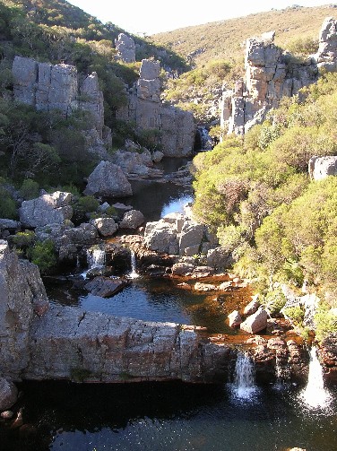 We now followed a defined track across Canowie Plain. The track becomes quite swampy as it nears the large pool and cascade where water can be collected for the remainder of the walk. A little further on we pass an excellent campsite big enough for three tents and here we need to find the correct track as there are quite a few. The main track from here the track has deteriorated quite considerably and we have to force ourselves through thick scrub that is often head high or taller. The track too has deteriorated and become badly eroded and care needed to be taken to prevent a mishap. The track ascends to a rocky ridge and around the other side it ascends further and we can hear the sound of waterfalls. At one stage Brett, who had forged ahead to make sure we were on the correct track had stopped to film our progress through the difficult scrub. Sue, unaware she was being filmed until the last moment, called out "You Bastard" as she realised she was being filmed. Brett assured her that her comment had been retained on film for posterity, and could well be featured on the Annual Club photo & movie CD.