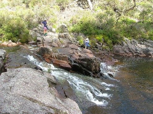 Returning to our packs we continued uphill for a short distance before finding the cairned route down to Broula Brook. We crossed the brook and ascended the next small ridge. On top was another rocky platform where it was decided we would stop for morning tea. With the sun shining down on us we relaxed with views of the Corang River and the Goodsell Creek area. The track from here descended to a small campsite next to a dry creek. We crossed the creek and ascended a small rocky slope. It was here 3 years ago that Brett, Gary and I had needed to take a compass bearing to take a negotiable route to the cascades on the Corang River. Brett was even commenting that after this ridge, there would be no track. However, to our immediate surprise upon reaching the top, we found ourselves on a well defined walking track. Surely this track hadn't been here 3 years ago, if so, how the hell could we have missed it. Incredulously we followed the track through the scrub and it wasn't too long before we arrived at the large campsite near the cascades. It was only 11.00am, too early for lunch, so we dropped our rucksacks, grabbed our cameras and went to explore the cascades.