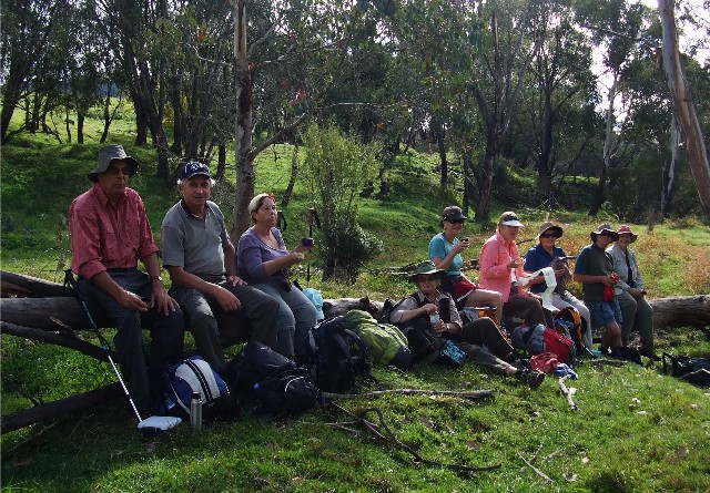 I addressed our remaining seven walkers, stating I would make this a quick lunch as I now felt uncomfortable allowing Pam and Kerrie to head back alone, and hoped we would be ready to move off again by 12.30pm. The campsite was open and green and contained a covered picnic area as well as an uncovered one, several barbecue areas and pit toilets. Denise went to use the toilets and came back with the story of finding a large huntsman spider in the bowl - hardly the 'Redback On The Toilet Seat'. After Harry Hill's talk about outback dunnies and snakes I was surprised she didn't find a slithering surprise in there though she said she had checked for snakes after hearing some of Harry's tales last night.