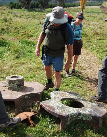 We crossed a swampy area via a large boardwalk that zigzagged its way across the field and climbed over more stiles and past more badly eroded hillocks. Sometimes crossing Burra Creek via a small bridge. After passing through some farmland we located a fallen tree that served itself perfectly for a morning tea spot and we relaxed in the sun eating our biscuits, muesli bars or nuts before moving on again. After ascending a small rise we came to some more machinery that resembled large cogs. These were parts of an impella, a large water pump used for sluicing methods. We found a couple more after crossing yet another stile. Our route now took us along the creek bank which had recently been sprayed with a 'roundup' like product in a bid to reclaim the walking track. This made the track very easy to follow as a yellow line through the mostly green vegetation. Much like a blonde streak through someone's dark hair.