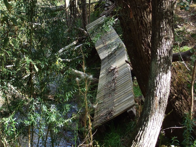 We crossed the small tributary and continued following the track and within 100 metres, Liz pointed out one of the 'Hume & Hovell' track markers that had the number six on it. This meant that we were 6km from Henry Angel Trackhead and that Junction Campsite was only 500 metres away. We upped the pace then came to Jock's Bridge. Jock Findlayson had joked about this really old bridge we had to cross just before the campsite and had made suggestions about sending out a search party for our bodies that night after it collapsed and sent us all tumbling into the deep dark waters of Burra Creek. The footbridge was lopsided, had a small dead tree in the middle sticking over the ramp and it was recommended only one person cross at a time - without stopping. Getting around the tree where the bridge was at its steepest warped incline was proving to be difficult. Suffice to say we all crossed safely and within 100 metres had arrived at Junction Campsite at exactly 12.10pm where we stopped for lunch.