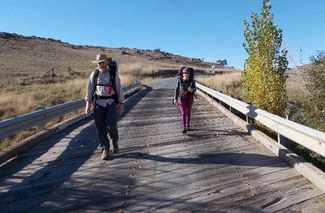 The walking became a lot quieter with less traffic, but we could hear the rumble of trucks making their way along the nearby motorway, but they got fainter and fainter the further we walked. We had a few cars go past from time to time which we deduced belonged to the landowners of this region. There was some nice rural scenery from the roadside that included nearby hills and the rising sun soon warmed us up. The hard bitumen soon gave way to gravel as we crossed Bowning Creek bridge. The terrain was hilly but never steep. My rucksack was still causing problems and many stops were spent attempting to adjust the harness system to a point where it became almost comfortable, I still had to keep making adjustments as I walked, it was most frustrating. If this cannot be resolved by the time we arrive in Tumut for our first food drop Iíll be swapping it for the Mont pack I left with Craig.