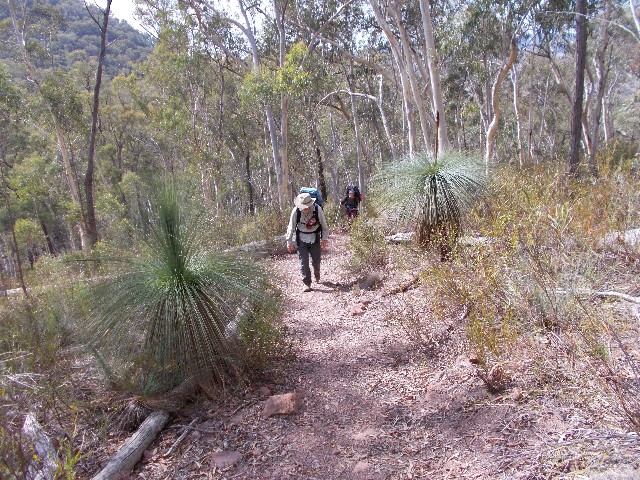 After a gradual ascent that went on for some distance we arrived at a spot we designated as suitable for lunch, even though it was only 11.45am. It was great to get the heavy packs off and enjoy some fluids and a snack. We guestimated (from Ian's ëFitbití) that we had already travelled 19km so far, we were doing excellent time (though we later discovered that Ian's settings were a little out). We checked our GPS and maps to discover we were possibly only 5.4km from Captain Campsite.