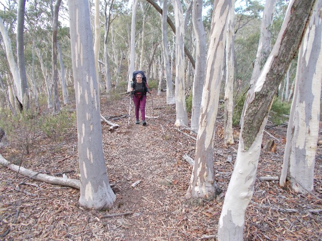 Julie follows the track through a forest of Brittle Gums during the descent to James Fitzpatrick Trackhead