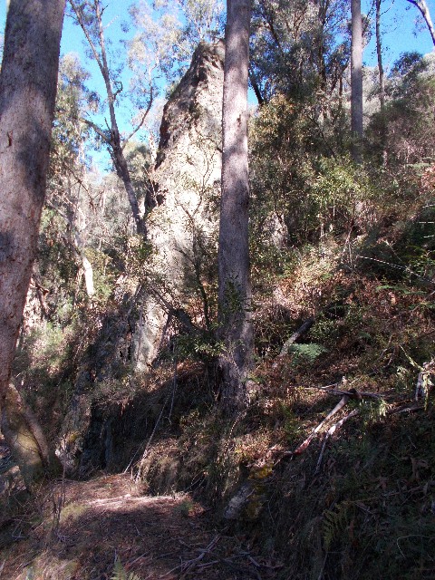 We crossed a damaged footbridge over Millers Creek (the planks askew at a strange angle) and found ourselves on a narrow benched track high above Millers Creek Gorge. We were careful here as one careless footstep could send you plummeting down the slope. Loose stones on the track and wet sections of mossy rock made the track a little treacherous. The track eventually turned to follow Pompey Pillar Creek and the countryside levelled out for a short distance. Kangaroos could be seen hopping away at our approach. Eventually Pompey Pillar came into view, a lone finger of eroded rock above the track. It's very hard to get good photographs of the pillar as surrounding trees block most of the best views.
