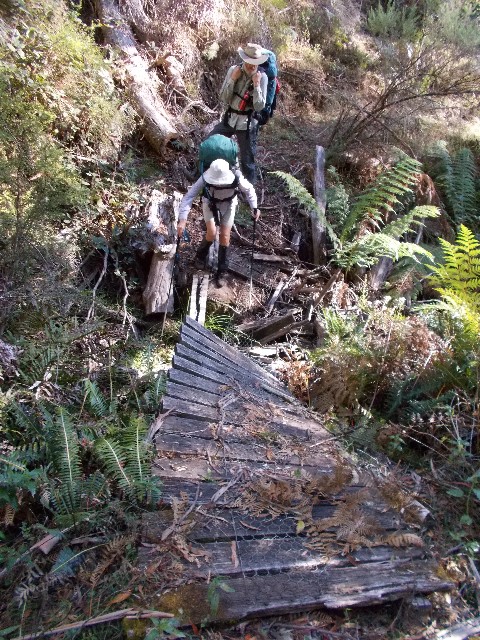 We negotiated a steep slope of loose scree and followed a track through forest wondering when the descent would finish, even though it felt like we had only descended half the 800 or so metres so far. At 1.30pm we stepped out of the forest into a clearing called 'The Hole', where Squizz signed the logbook on our behalf. No poems for this logbook. The clearing used to be a farm where trees removed from the forest to create farmland created the Hole in the forest. It was settled by Jim McNamara in 1888. He was a shearer who disappeared for six months of the year, usually returning in time for Christmas. He fathered 13 children here, all of which worked as a labour force on the small farm. We felt that this area would serve perfectly a spot as a camping area. Just add a toilet, shelter and water tank, even if it is only 6.5km from our destination today. We were to find that would have been a great idea as it was the longest and hardest 6.5km walk most of us had ever taken.