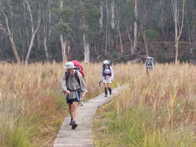Raincoats were put on and we were still able to set off along the track by our planned time of 7.45am. Although we had a 25km walk today, much of it was going to be downhill, but there was still some uphill to negotiate. As soon as we set off the rain ceased and over the next hour we all took opportunities to put our raincoats away. We set off behind the campsite by crossing a footbridge on Micalong Creek where we gathered our drinking water then followed a foot track for one kilometre through the forest to Brindabella Road. After crossing the road bridge we turned right onto Micalong Road and followed this unsealed road for some distance, eventually reaching Micalong Swamp.
