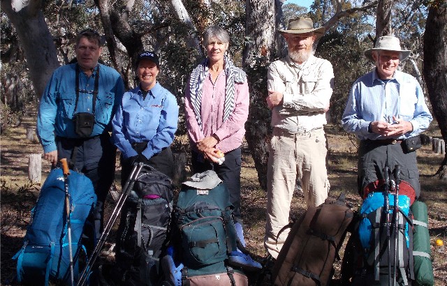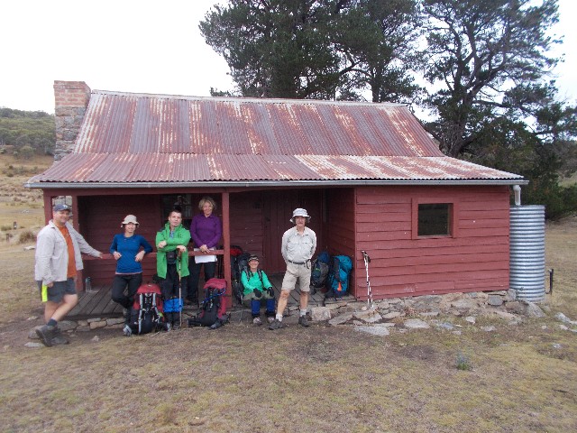 March 2017: Westermans Hut on the Settlers Track Namadgi NP L-R: Steve Carter, Shay Simpson, Paul Ellis, Julie Sunley, Roni Giacobetti and Gerald Dodgson. Photo: Sean Sunley