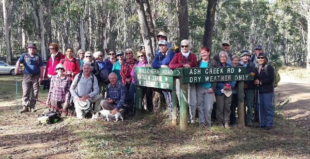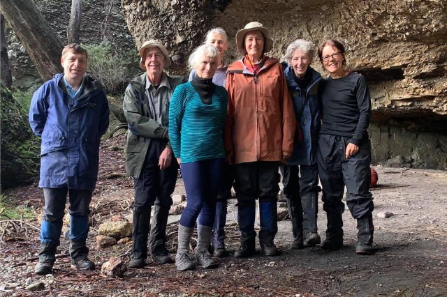 Budawangs 3 day through hike from Sassafras to Wog Wog 2019: L-R - Paul, John, Leslie, Jennifer, Gerta, Gillian and Kynie. Photo Courtesy Kynie Evison