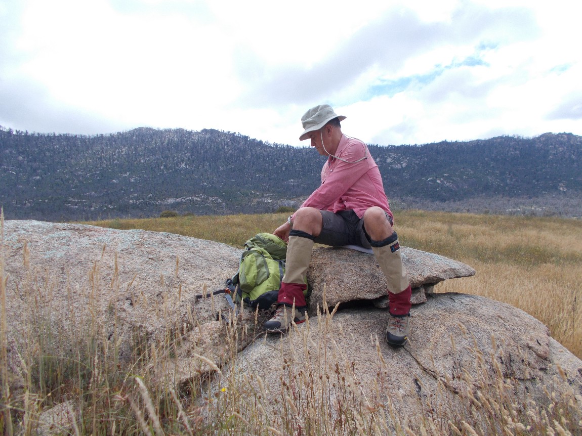 Craig chooses to take his morning tea break on top of a small boulder away from all the long weeds during our first walk along the Rendezvous Creek Valley in Namadgi National Park. We were on the lookout for the ruins of Rowleys Hut which burned down in 2003. We were unsuccessful on this day, but we would have better luck on our return the following week.