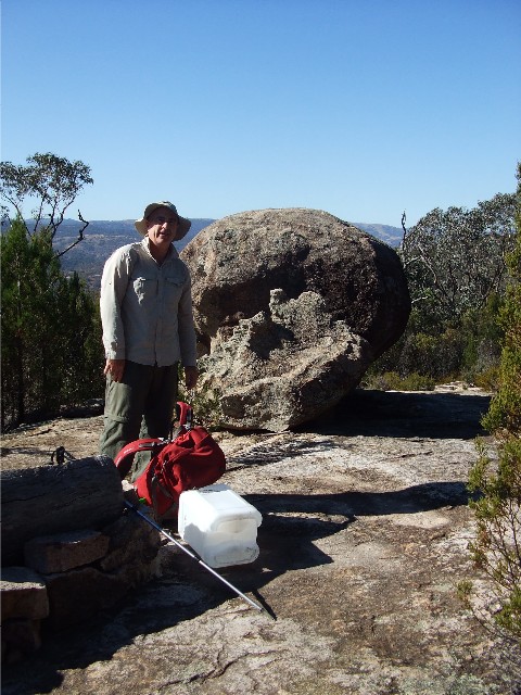 After 45 minutes we arrived at Cypress Pine Lookout. The spot is on an open rock slab dominated by a large round marble-like boulder and has impressive views back down to the Namadgi Visitors Centre and across the southern suburbs of Canberra and its surrounding mountain ranges. Even Black Mountain Tower can be seen through today's smoke haze, caused by some hazard reduction burning being undertaken in the hills surrounding Tuggeranong. The rest of our group had patiently waited for us to arrive, sampled some of Sean's home-made Macadamia and Cherry slice and then sauntered off onto the next stage of the walk.