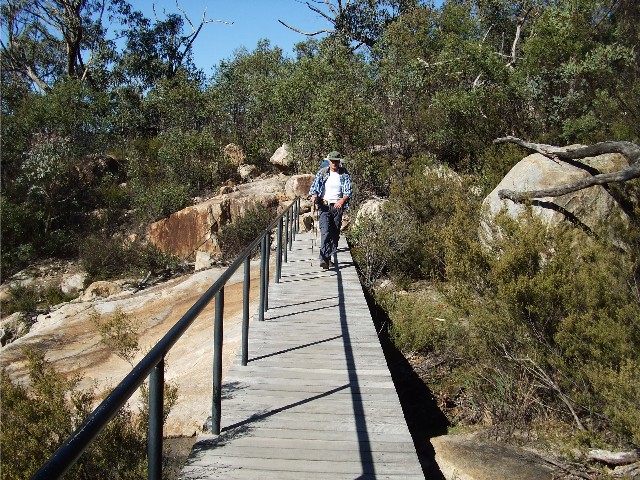 According to some reports on this walk the first 532 metres of ascent is very steep and the track catches the heat of the sun for much of the day. Even on the verge of a Canberra winter it is warm enough to produce a sweat that leaves your shirt totally soaked. I was glad I had brought along my hydralyte tablets. Most of this rough ascent is along steps which of course, is much harder to climb than a slope. Much of the ascent to our first stopping point is gradual and scenic. We can still hear the noise of traffic moving up and down the Naas Road and the buzz of model aeroplanes from the nearby model aero club.