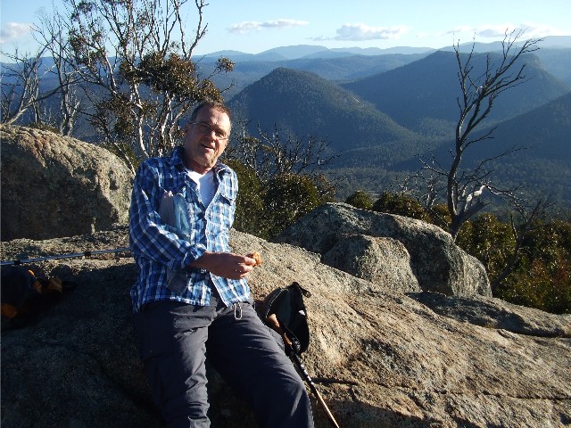Craig takes a rest break on the summit of Mt Tennant with the Australian Alps to the south behind him