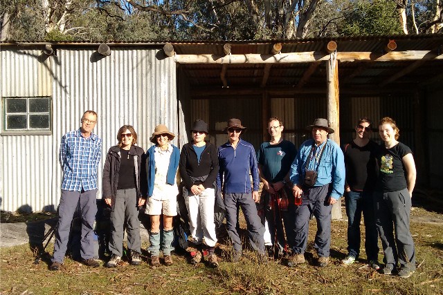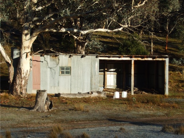 Bushfold Flats Hut, is sometimes known as Bushfold Hut, Reads Hut or Dr Pearsons Hut and the original was built in 1884 by the McKeahnie family. The hut has been rebuilt several times, most recently in 2004 after the previous hut was damaged in the 2003 bushfires and had to be demolished. The hut is now built from wood and the remains of the previous hut's corrugated iron and built on a concrete slab. It has an iron fireplace but little in the way of furniture. The hut is a two room structure with a single enclosed room and an adjacent three sided machinery shed. There are remnants of an old sheep pen and animal holding yard adjacent to the hut. Sean had organised two large containers of fresh water to be delivered to the hut by National Park rangers during the week as there is little reliable water here. Sean and another would be carrying the containers back out tomorrow.