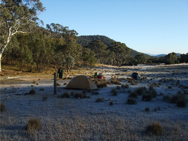 The billy was boiled for coffee and a variety of breakfast cereals were eaten before packing up. Looking out the hut door the rising sun still hadn't touched any of the tents. It looked like we would be packing away frozen or soaking wet shelters this morning. I decided to wait as long as possible. As we had arrived in the last vestiges of light yesterday we hadn't had a chance to look at the surrounding countryside so Craig and I had a look around. If we had pitched our tents 100 metres to the north next to the track our tents would now be catching the warm sun, but we were not to know that last night. To the west were the impressive hills that included Booroomba Rocks, a side track on the AAWT well worth visiting for its impressive views of Canberra. The woods and grasslands behind the hut were also getting bright sunshine, but no tent could be pitched on their steep slopes.