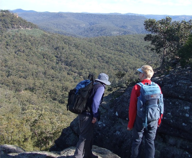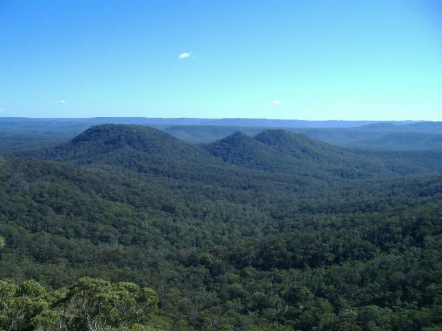Wednesday 23rd July 2008 found me joining up with 23 other members of the Shoalhaven Bushwalkers for the Three Peaks Walk near Coolendel west of Nowra. The walk was being led by Sue Josephson and was billed as 'Past Her Peak' due to the fact that Sue hadn't led the walk for many years. In fact I had not done the walk since Sue last put it on for the club in 2003. The walk is noted as a club classic and it's certainly on my list as one of the 5 best day walks in the Shoalhaven district. The Three Peaks can be seen from the cliff edge near the Old Burrier Fire Trail, just before we descend toward McKenzie Saddle on the Two Rivers Track. The weather couldn't have been better for today's walk, sunny, clear skies, but quite cool.