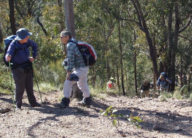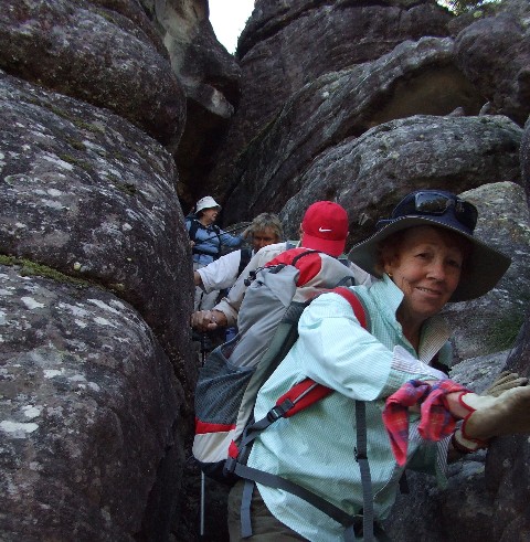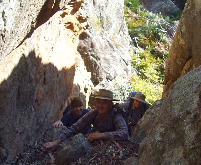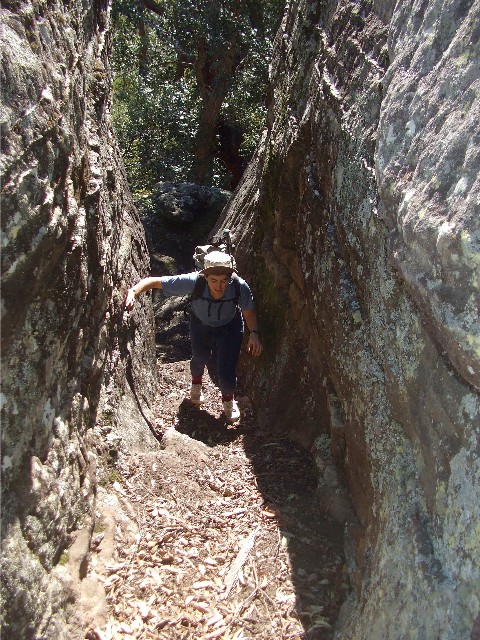 We were standing near what I remembered to be a narrow pass onto the top of Grady Hill, a route we had taken on that very hot day in September 2001. Strangely Sue couldn't remember this pass and I remembered that when she last led this walk in August 2003 we had missed this pass and continued around the base of the cliff line. Sue was keen to repeat the 2003 route, but she allowed me permission to lead a small group who were very keen in following the route across the top while Sue led the rest along the base of the cliff line. Next to a hollow cave-like feature is a narrow chute that can be scrambled up onto the top. It's much easier than it looks and soon I'm standing at the top and waiting for the rest of my party which included Lani, Peter, Alf and Ross. The top of Grady Hill was covered in light forest and there was very little undergrowth, so the going was very easy. Within less than 100 metres we came to another pass which looked very simple to climb, just as Sue and the rest of the group arrived below us. They suddenly decided to come and join up with my group on top of Grady Hill. The only problem was that there was one section that was proving difficult to climb over, so I scrambled down to give several of the group a hand in climbing up. Overall I think Sue's group took the harder option, but everyone was finally together again.