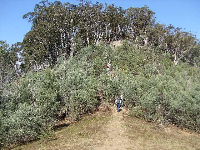 We now headed southward along the ridge top towards Grady Hill. A faint track led us across the top where the ridge sloped down on either side, leaving a very narrow path on top. The track descended to a small open saddle before ascending steeply once again. An approximate 50 metre gain in height over a small distance, though not as steep as the previous climb. Once near the top, the ridge flattened out as it passed by several rocky outcrops, then over to an open area just below the top of Grady Hill. Here we waited for the slower back group to catch up.