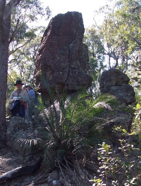Alf poses by an impressive rock formation near the top of Grady Hill. A lone burrawang palm dominates the foreground