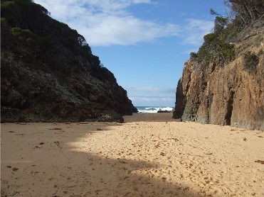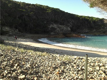 The gap itself is a narrow area of flat sand between two cliff lines. Once upon a time Wallagoot Lake obviously emptied into the sea here before the build-up of sand sealed the entrance off from the lake. We sat on some rocks near the sea's edge and enjoyed morning tea, unaware of the large green diamond python sunbaking on a narrow ledge above our heads (until later). We watched more sea eagle activity above us. We were to witness much activity by these birds of prey during today's walk.
