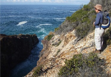 Resumption of the walk had us ascending and descending several times until we descended steeply to Boulder Bay. During the walk along the Kangarutha in February I had taken a swim in this bay to cool off during lunch. The water was certainly colder now. Shaped very similar to Games Bay in the south, Boulder Bay also has a beach of large pebbles and rocks, thus giving it its name. We now had more ascending and descending for the last section of track, though by now we seemed to be handling the ascents a lot better, my failure to remember my trekking pole this morning had caused me enough grief on the descents and my right knee and left ankle were now very sore. We came to an open section of heathland and discovered another interesting foot track that again took us to the coastal cliffs. Paul and I went a little further than the rest of our group and discovered an interesting view across Wild Horse Bay from near Wild Horse Point though no more spectacular than what we had already seen today.