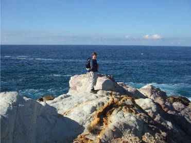 We now had a long stretch of track to Boulder Bay. We back tracked from White Rock to locate the Kangarutha Track as it descended steeply to a creek then ascended just as steeply again to the ridge. Another side track took us to a rocky cliff edge where we had a view of a multicoloured island of rock just near the coast. The orange and purple colours on the rock were caused by lichens. The track again descended to a creek which we found took us to a picturesque rocky area where the creek met the sea. We decided to stop for lunch here and watch the waves cascading over the rocks nearby.