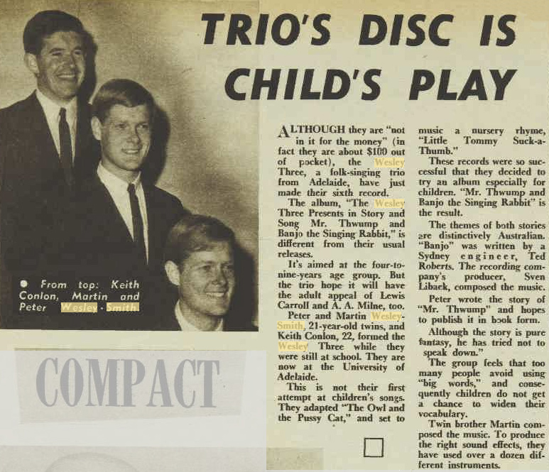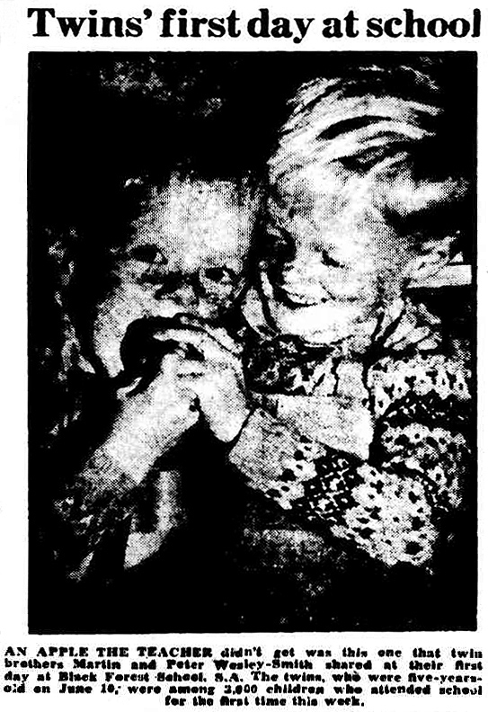 Here is an old clipping about the folk group I sang and played in when I was at school and university. Even older: a photograph of Peter and me, published in The Advertiser, on our first day at school.