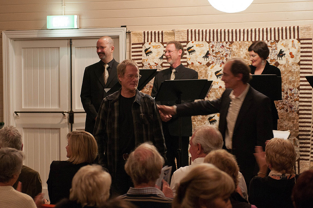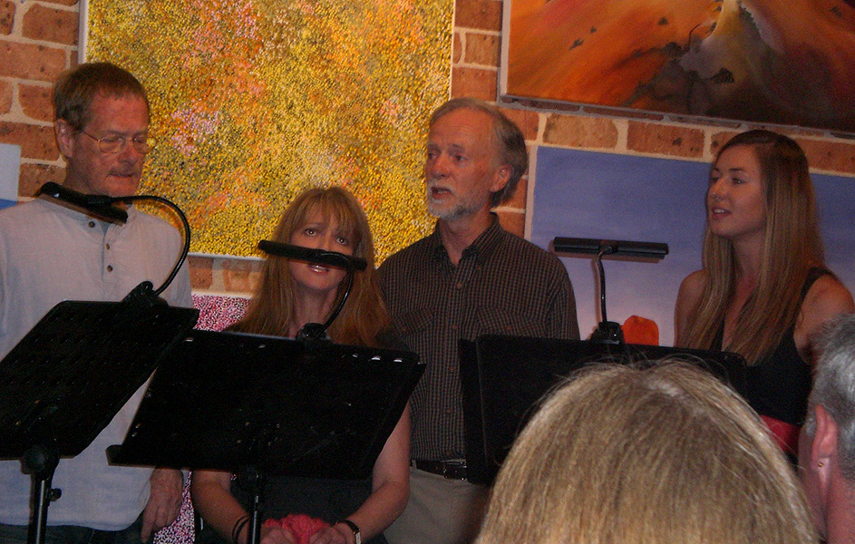 Last night the seven-member Thirsty Night Singers sang at a private function in Kangaroo Valley, earning themselves an enthusiastic reception! Click here for a photo, taken last night, of four members of the group: me (at left), then Patsy Radic (wearing a Freddie Mercury moustache), Peter Stanton and Nadia Intihar. Members of the group not pictured are Nell Britton, Janette Carter and Peter Morgan. Photo by Louise Morgan.
