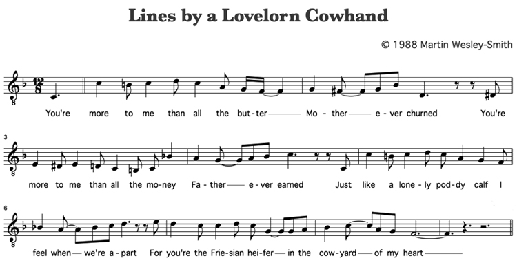 In 1988 I was commissioned to compose a large choral piece for the Intervarsity Choral Festival of that year. It was Australia's Bicentennial - two hundred years of white settlement - and I wanted to do a piece that looked at Australian society from different angles, some nostalgic, some loving, some critical ... This poem seemed to fit right in. I set it to music, then sought permission to use it in the piece. Well, after a long process, during which executives of The Herald and Weekly Times, which owned the copyright in the Bluey and Curly cartoons, went through every one they'd ever published - but couldn't find it. Someone else must own the copyright, but I now have no idea who does or where I got it from. The song went into the piece - Songs of Australia - with a note asking any aggrieved copyright owner to get in touch (no-one has). Here's the melody: