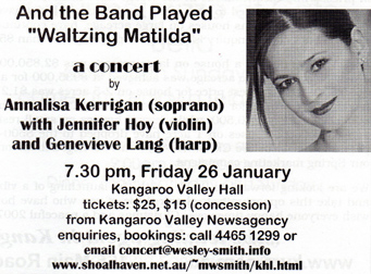 After the event (a great success from every point of view!), the following review, by Carl Leddy, appeared in local rag The Kangaroo Valley Voice, February 2007, p7: