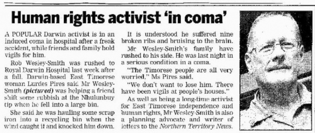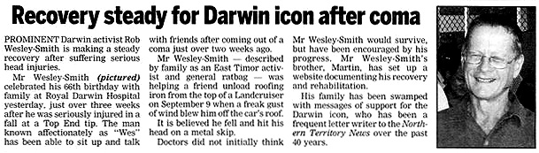 Rob, Pob hwyl is Welsh for every good wish. I was shocked to hear of your accident and its serious consequences, and, until this blog was sent to me did not know how to get up to date news. So glad your reading and linguistic skills are back again. As a member of the Darwin-Dili sister city committee and a long-time well-wisher of East Timor I look forward to seeing you stirring things up again when you are next there ...