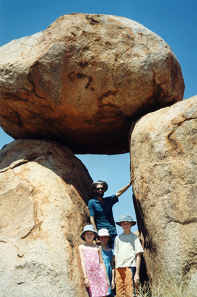 Tennant Creek The Devil's Marbles 106 kms south of Tennant Creek off the Stuart Highway are a huge group of Immense granite boulders. The boulders are precariously balanced and were a spectacular place to visit. According to the children..."The Devil's Marbles was one of my favourite places because we got to play on the rocks. They were extremely round and there were hundreds of them. "...."I liked the Devil's Marbles but it was very hot and I found a cave. My hat flew away in the wind and Raymond found it."...."We played music on the rocks and there were good hiding places. We also had a picnic high on the rocks in the shade. We had a lots of walks around the rocks". At the Tennant Creek caravan park we went for a swim in the pool and had a barbecue under a sheltered tree in which a very temperamental light was attatched. Sometimes it decieded to work and at other times it simply refused. It was a hot day but the water was cold. We spent the next day at Mary Ann Recreational Dam playing on the lush green grass and watching the black kites flying around. Built in 1981 this man made lake has a shady picnic area, playground, nature walks, wildflowers and birdlife. |
