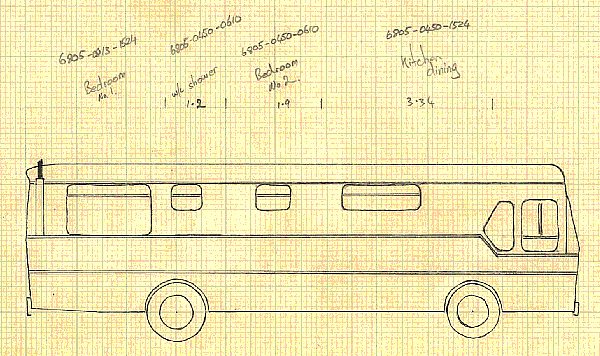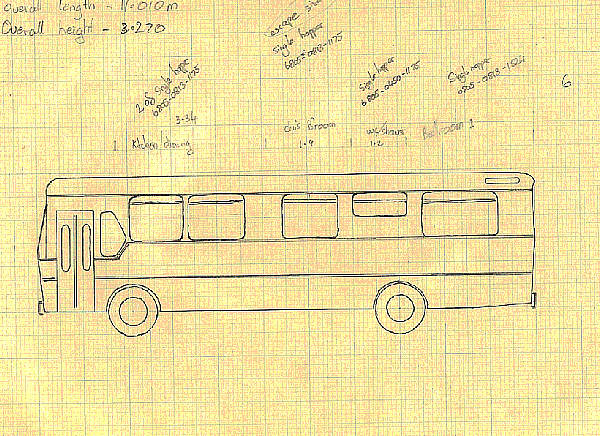 The external look of the bus would be largely dependent upon the internal layout. The placement of windows needed to be considered for the best use of viewing as well as for ventilation. The windows chosen are the Australite series of windows supplied from Camec Industries. They are a single hopper, four and some two cornered radius with toughened and tinted safety glass. The original front roof line is to be lifted and finished inline with the existing roof. This front section is fibreglass and I have enlisted the help of a shipwright friend to assist with this task. The diagram/sketches below give a general image of the intended finished look of the bus. They are roughly drawn to scale so proportions are close. The roof hatches, air conditioners and any lights etc have been left off these drawings. |